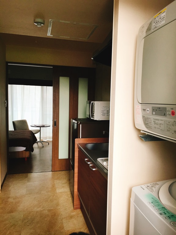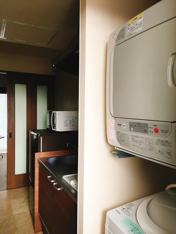 入門之後,右手邊就是洗衣、乾衣機緊接著廚房、冰箱(左邊是衛浴),直行到底便是房間