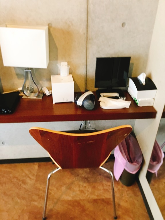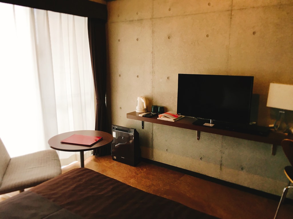 房間內部是我喜歡的沉靜風格,有一大片落地窗,一個小圓桌,還有個小陽台(最後洗衣服非常好用)