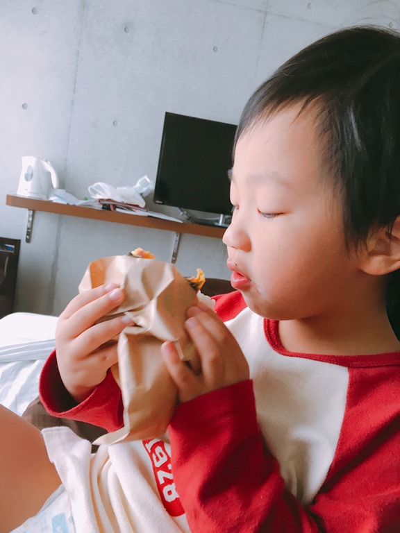 看看這個小吃貨,睡眼惺忪就大口開吃了,完全沒在客氣的,要不是這服務看看排隊的人潮,我應該是沒機會吃到的吧XD