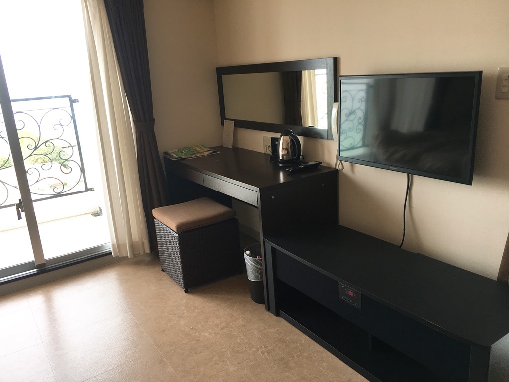 設備一應俱全,靠近窗戶的是梳妝台&電視,我的房間很幸運有兩個大陽台