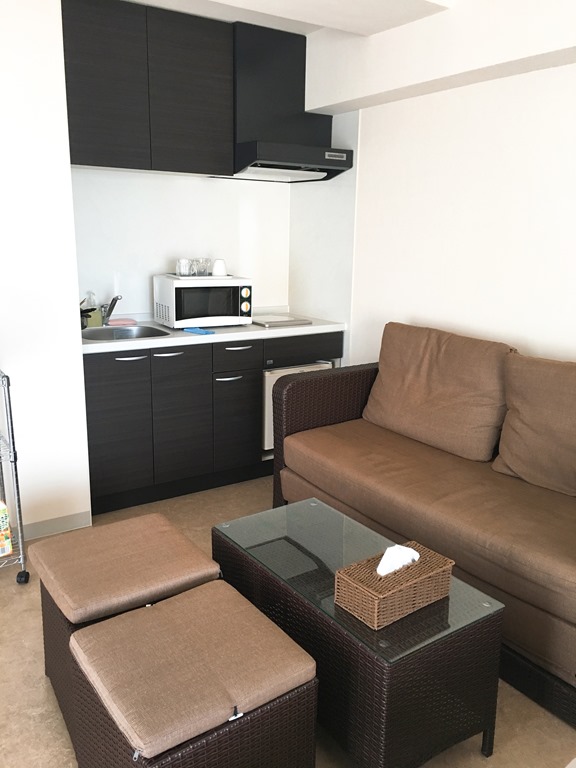 有一個小廚房、沙發(沙發超級軟坐起來不是很舒服,後來發現原來是沙發床)